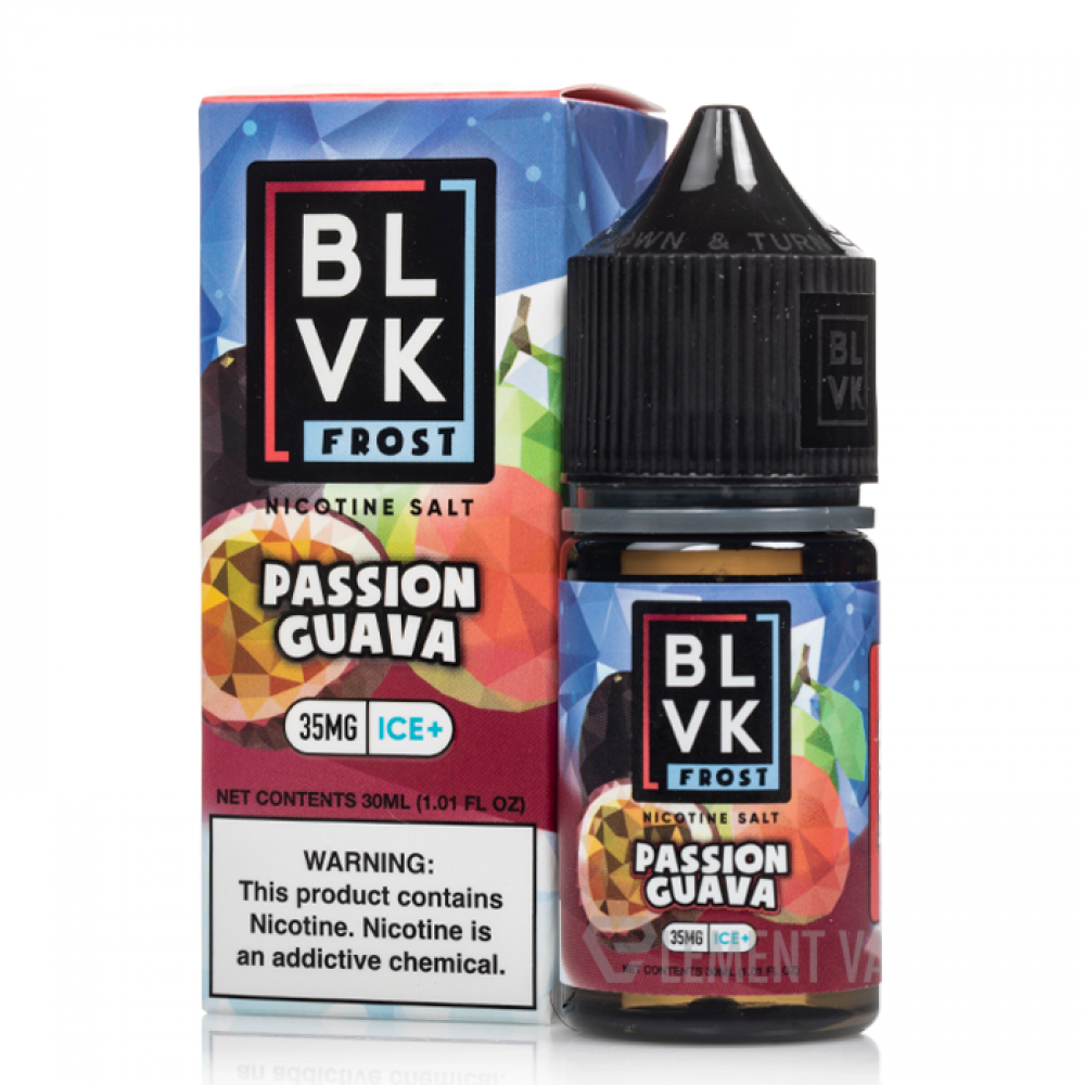 BLVK Frost – Passion Guava – Nic Salt 30ml fusiona la intensidad de la maracuyá con la exuberancia de la guayaba. Disponible en 35mg y 50mg de sales de nicotina, brinda un vapeo tropical y revitalizante.